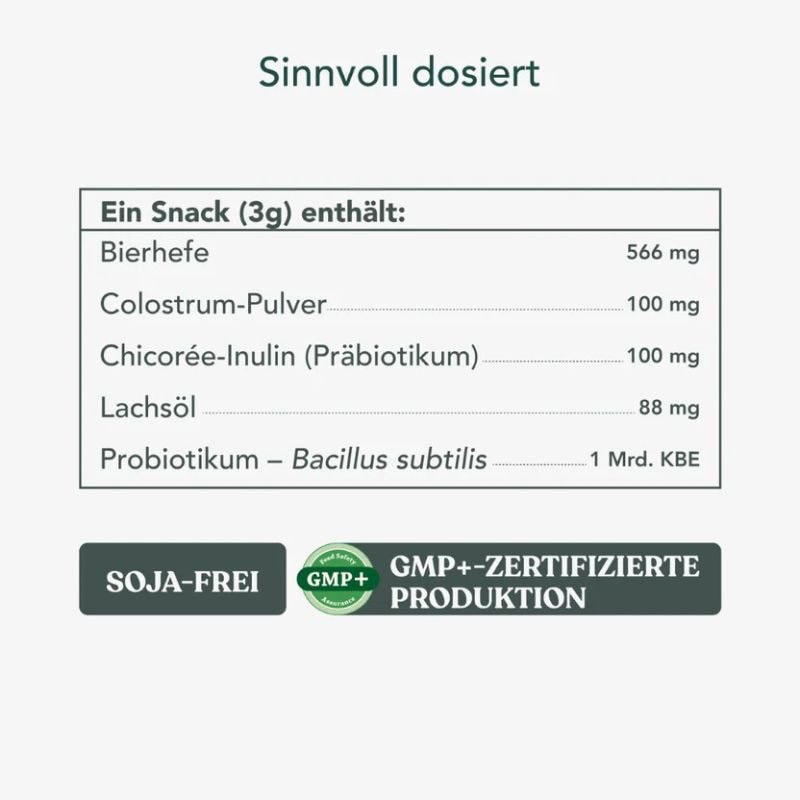 Ein Snack (3 g) enthält: Bierhefe 566 mg, Colostrum-Pulver 100 mg, Chicorée-Inulin (Präbiotikum) 100 mg, Lachsöl 88 mg, Probiotikum – Bacillus subtilis 1 Mrd. KBE.